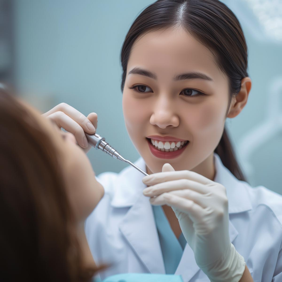 歯科医院の清潔感ある診察室、アジア人男性医師と30代女性が話している.